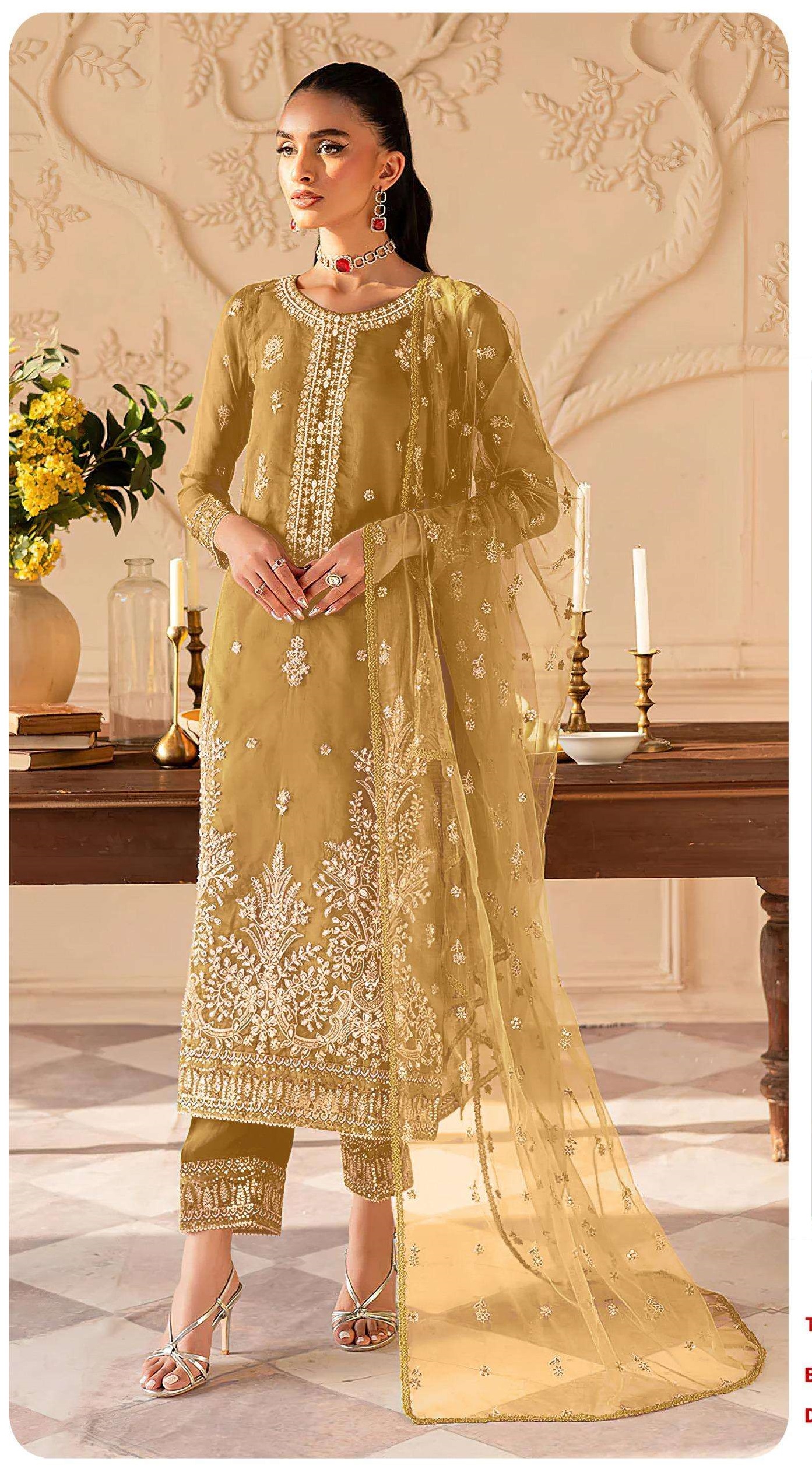 Top : Orangza With Heavy Embroidery With Khatli Work | Cut:- 2.50 Mtr Bottom :Dull Santoon | Cut:- 2.50 Mtr Dupatta : Oragnza With Heavy Embroidered | Cut:- 2 Mtr |